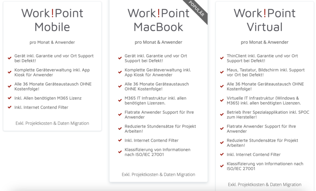 Egal ob Mobile, MacBook oder Virtueller Arbeitsplatz, mit unserem Work!Point Angebot brauchst Du Dir keine Sorgen mehr zu machen. Du bekommst die gesamte IT inkl. Arbeitsgerät komplett verwaltet